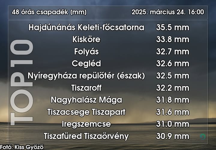 A bejegyzéshez készített infografika szerint Hajdúnánáson hétfő délutánig 35,5 milliméter esett 48 óra alatt. A második legtöbb csapadékot az elmúlt 48 órában a Heves vármegyei Kiskörén mérték (33,8 millimétert), a harmadik legtöbbet a szintén Hajdú-Bihar vármegyei Folyás községben (32,7 milliméter).