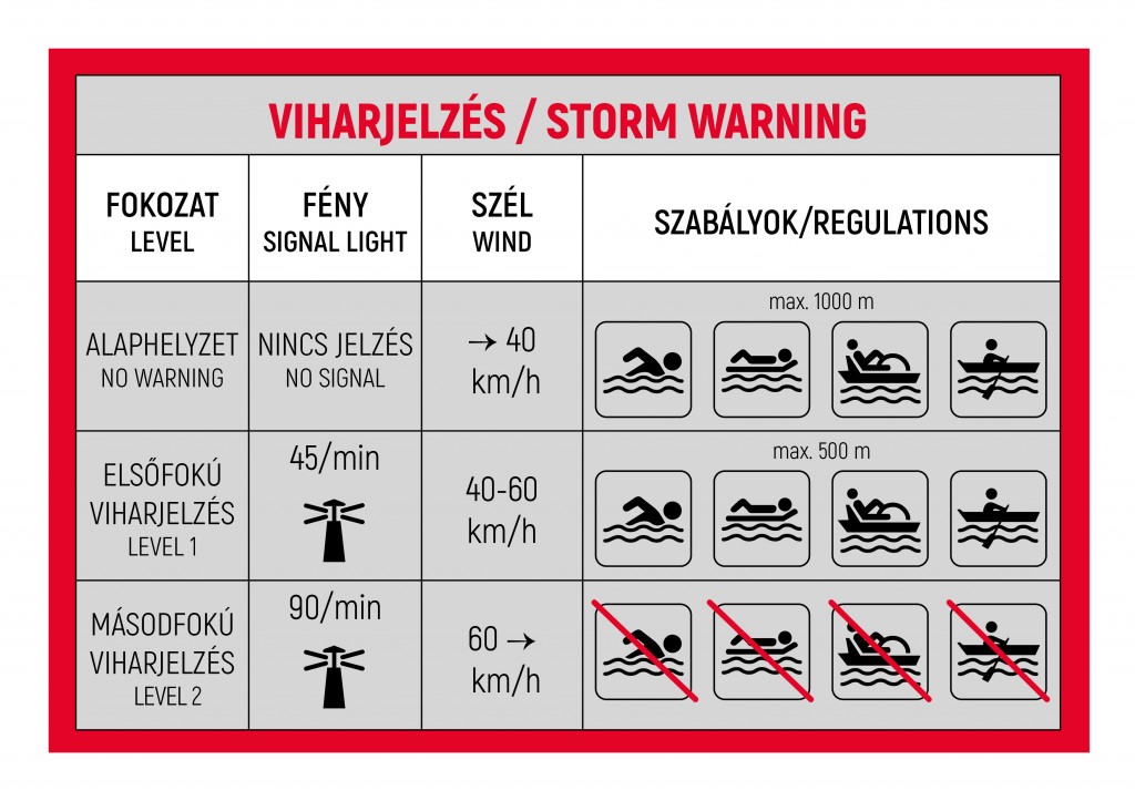 - Másodfokú viharjelzés esetén a lámpák percenként 90-szer villannak fel és ilyenkor tilos a vízben tartózkodni.