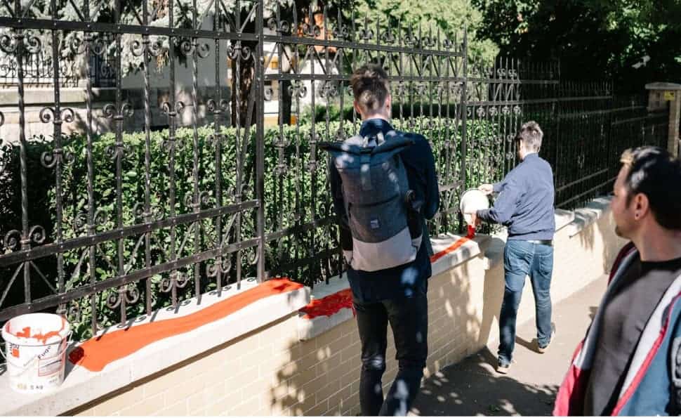 A felszólalás után Stummer egy fehér vödörből vörös festéket öntött a hivatal bejáratának egyik oszlopára. A festék színe nem véletlen: a demonstrálók ezzel kívánták hangsúlyozni, hogy a kormány intézkedései szerintük veszélyesek a demokratikus berendezkedésre nézve. A vörös festék szimbolikus jelentőséggel bírt – egyes értelmezések szerint a szabadság véráldozatára vagy a veszélyre utalt.