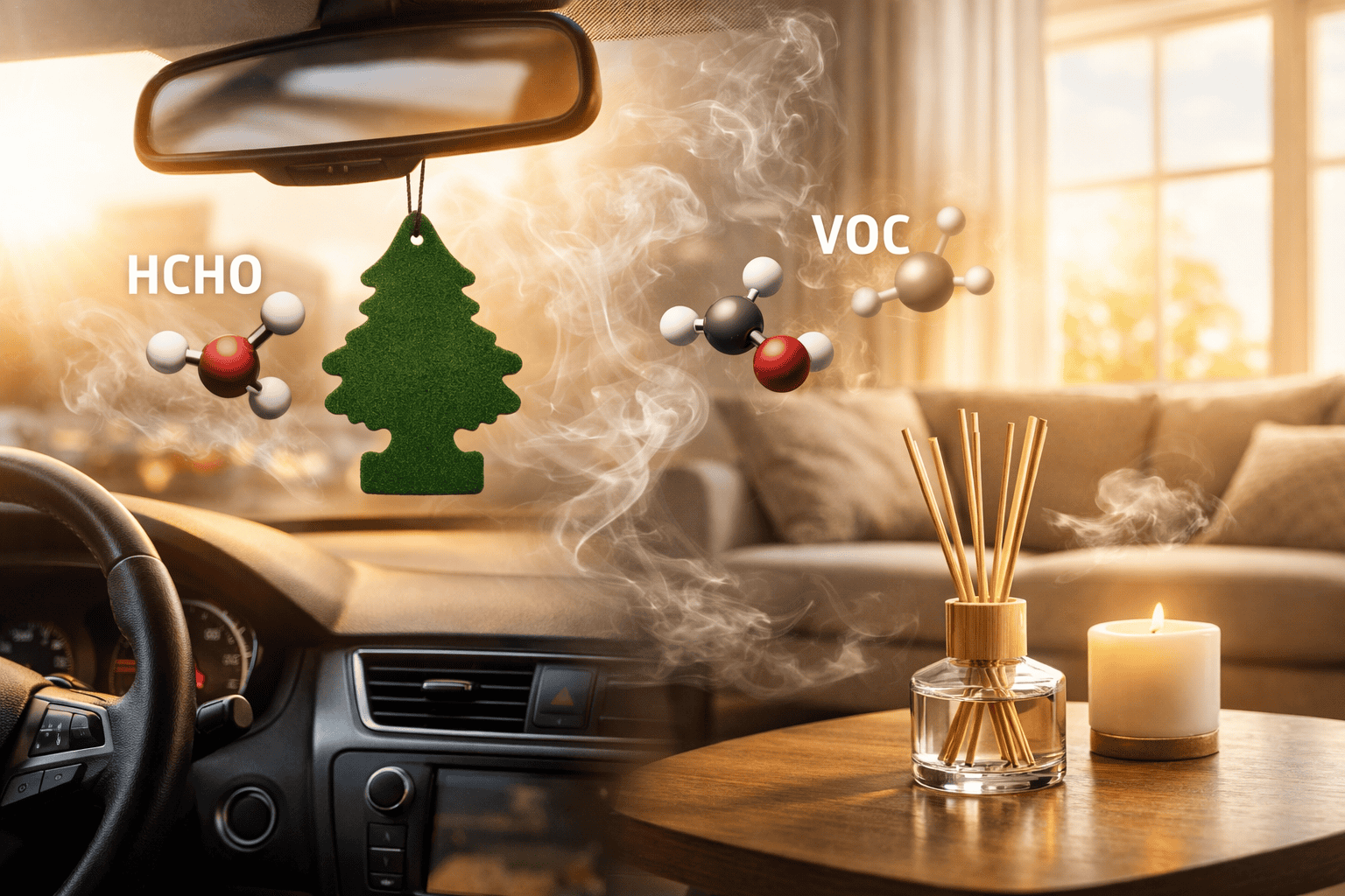 Az autó utastere sajátos környezet. Nyári hónapokban a parkoló járművek belső hőmérséklete jelentősen megemelkedhet, ami fokozhatja bizonyos vegyületek felszabadulását. Tudományos mérések igazolták, hogy extrém hőhatás esetén egyes műanyagokból és illatanyag-hordozókból formaldehid is felszabadulhat.