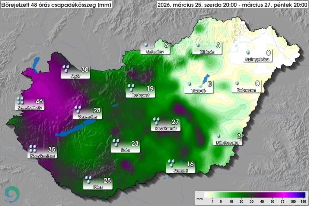 A csapadék eloszlása jelentős különbségeket mutat az országon belül. A Dunántúlon tartós, sok helyen intenzív esőzés várható, amely akár órákon keresztül is fennmaradhat. A nyugati megyékben különösen nagy mennyiségű csapadék hullhat, ami lokálisan vízfelhalmozódást és nehezebb közlekedési körülményeket is okozhat.